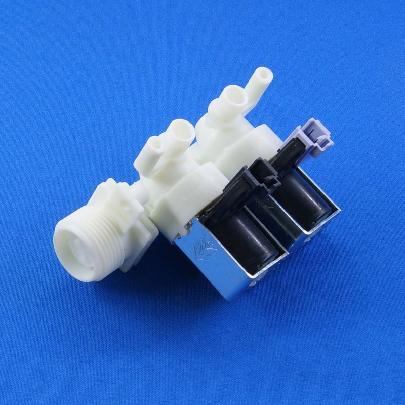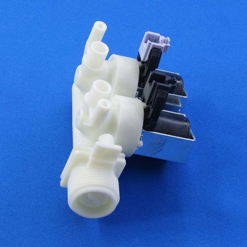 Электромагнитный (впускной) клапан подачи (залива) воды, клеммы мини под фишку, выходы в ряд 2 на 90 градусов (2х90), номер, применяется для стиральной машины Indesit, Ariston, Hotpoint, Aqualtis, Atlant и др. Диаметр выхода - 10 мм.