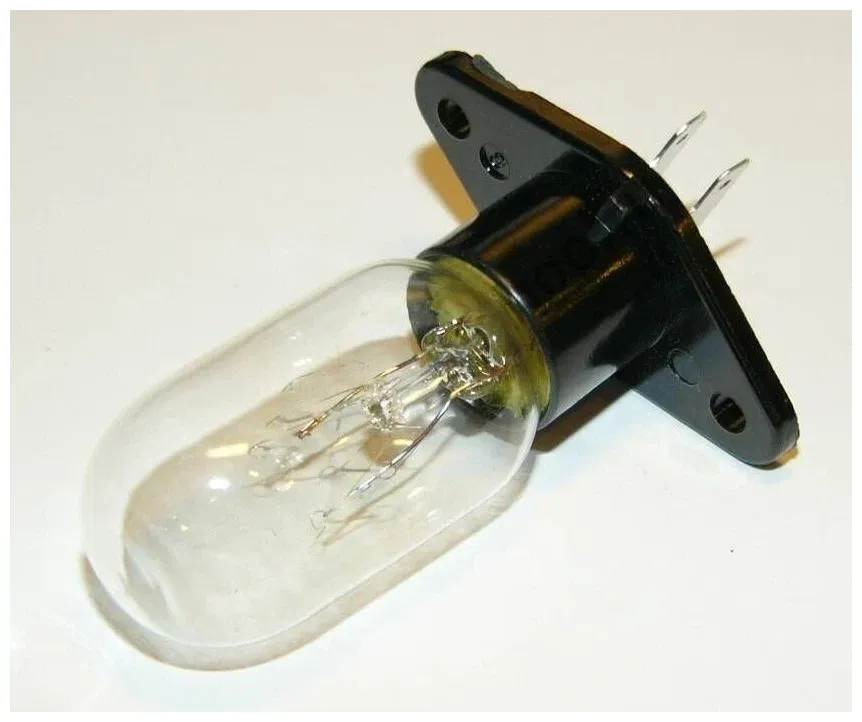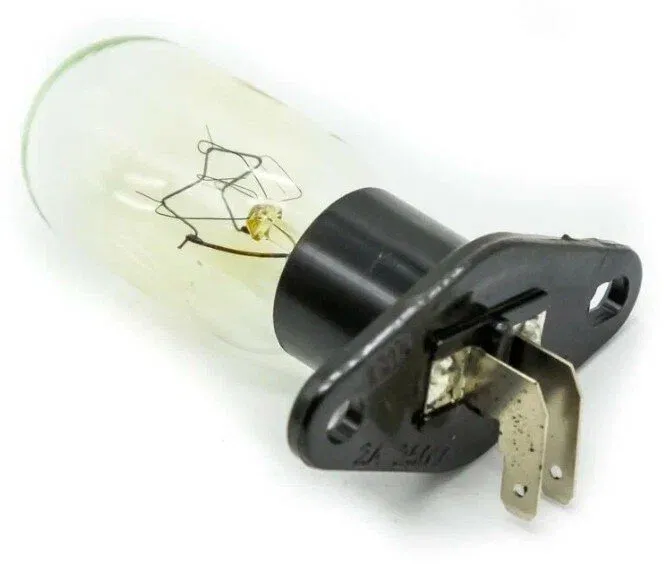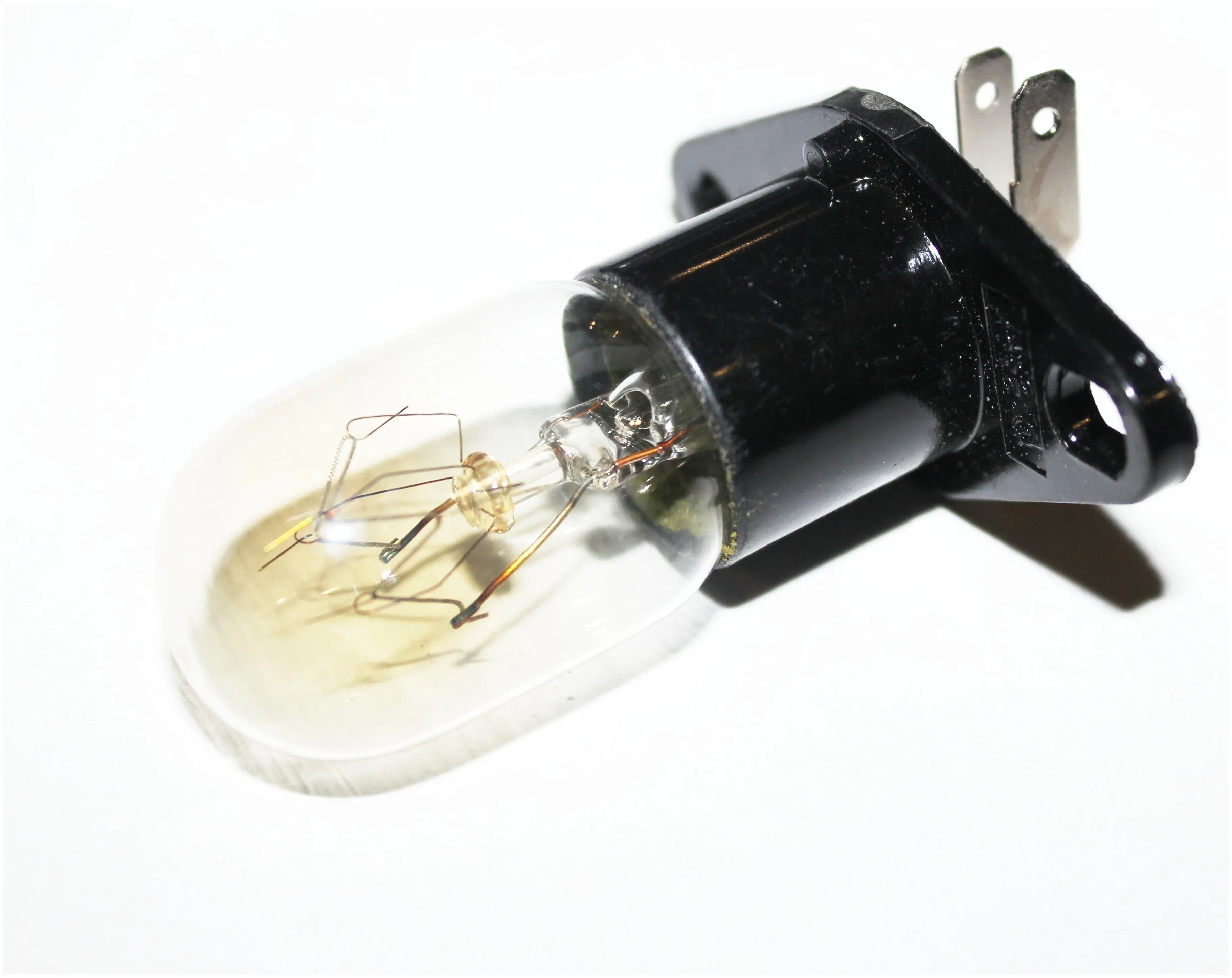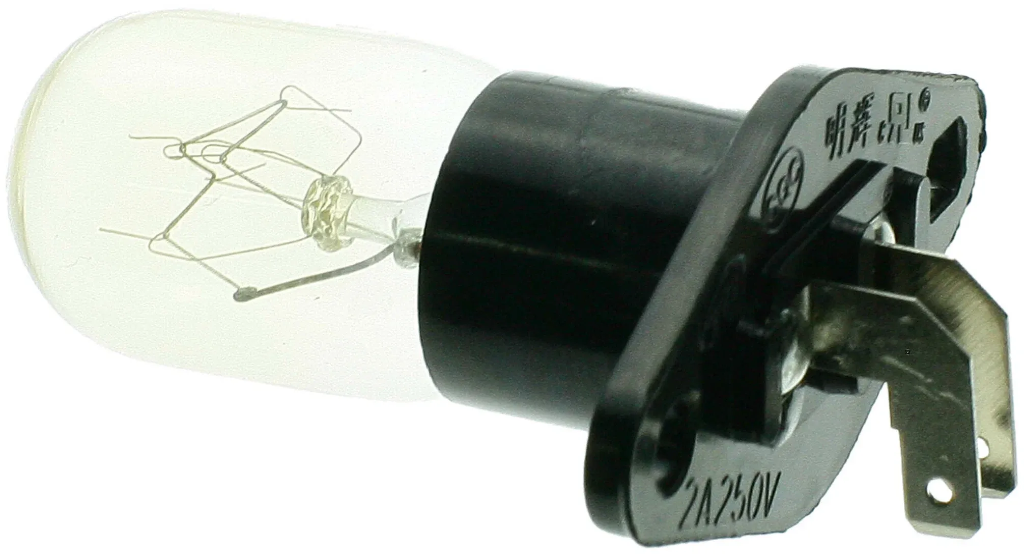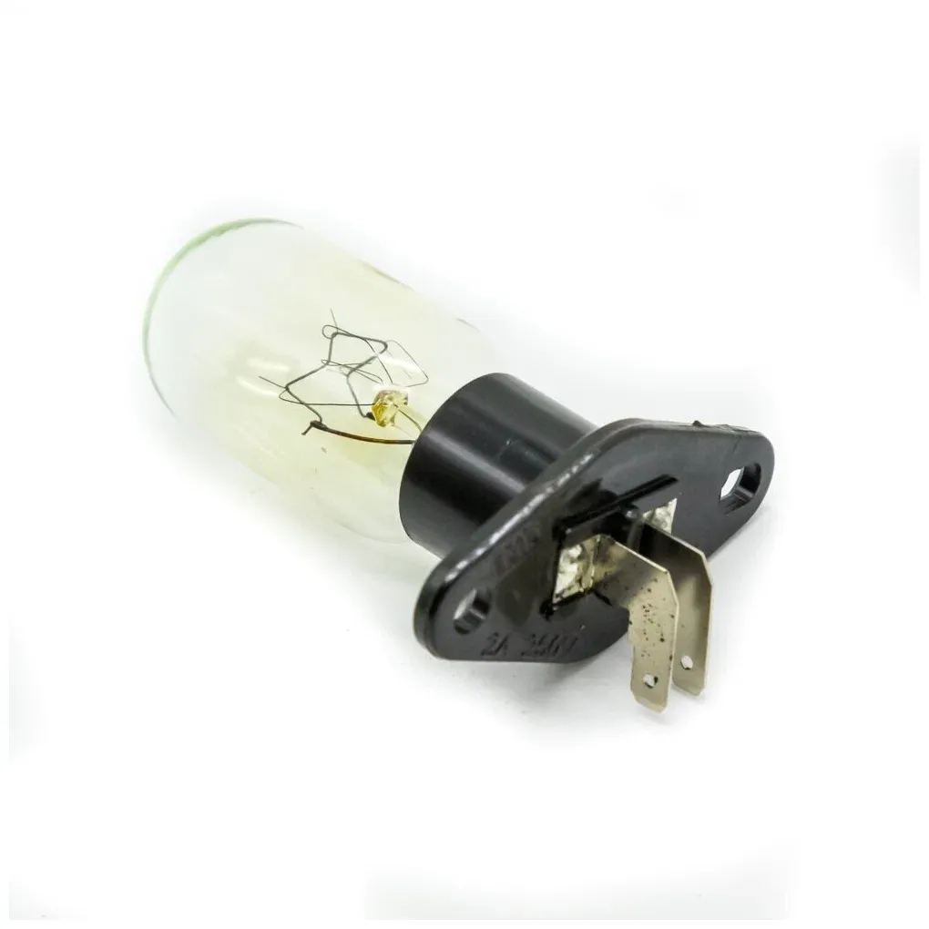 Лампочка (лампа) с патроном в сборе для подсветки в микроволновой печи (СВЧ). Сила тока 2 A (Ампера), напряжение - 250 V (Вольт). Мощность 20 W (Ватт). Количество контактов - 2 шт, форма контактов - "Г" образная. Универсальная запчасть.
