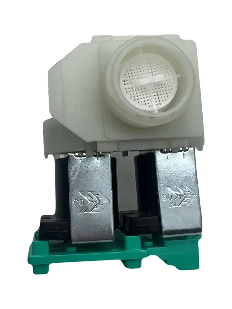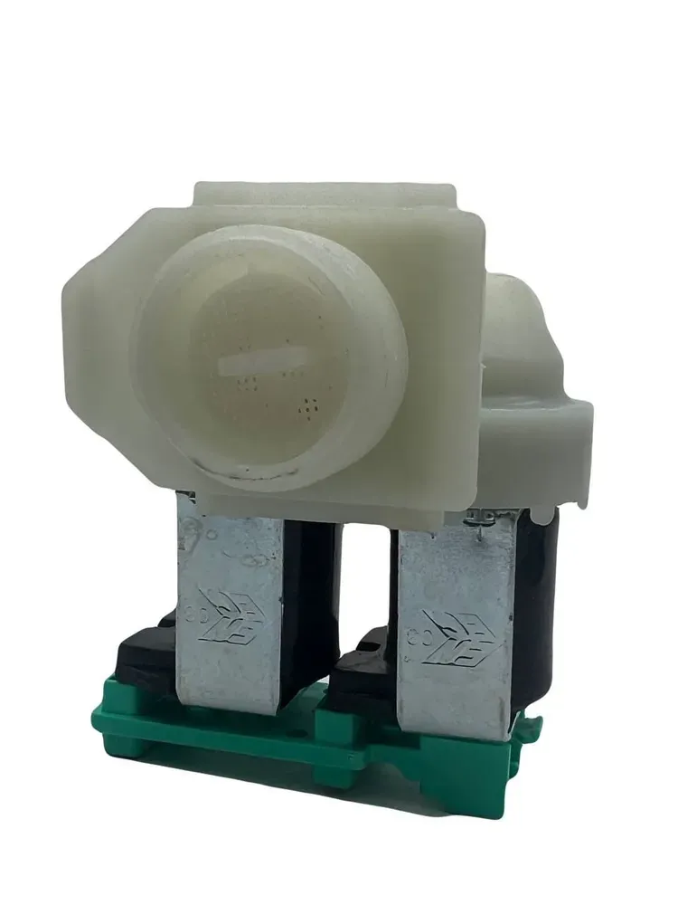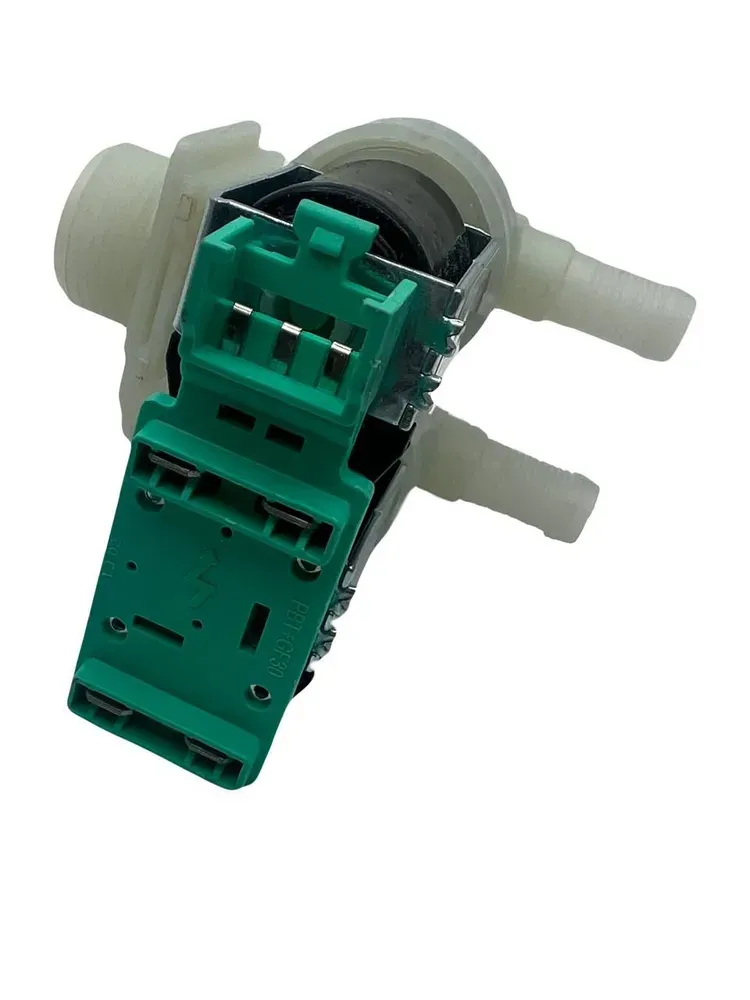 Клапан электромагнитный, впускной (подачи воды) для стиральных машин Bosch, Siemens. Диаметр входа 3/4 дюйма (резьба), диаметр выходов - 10 мм, 2 потока, угол между входом и выходами - 180 градусов.